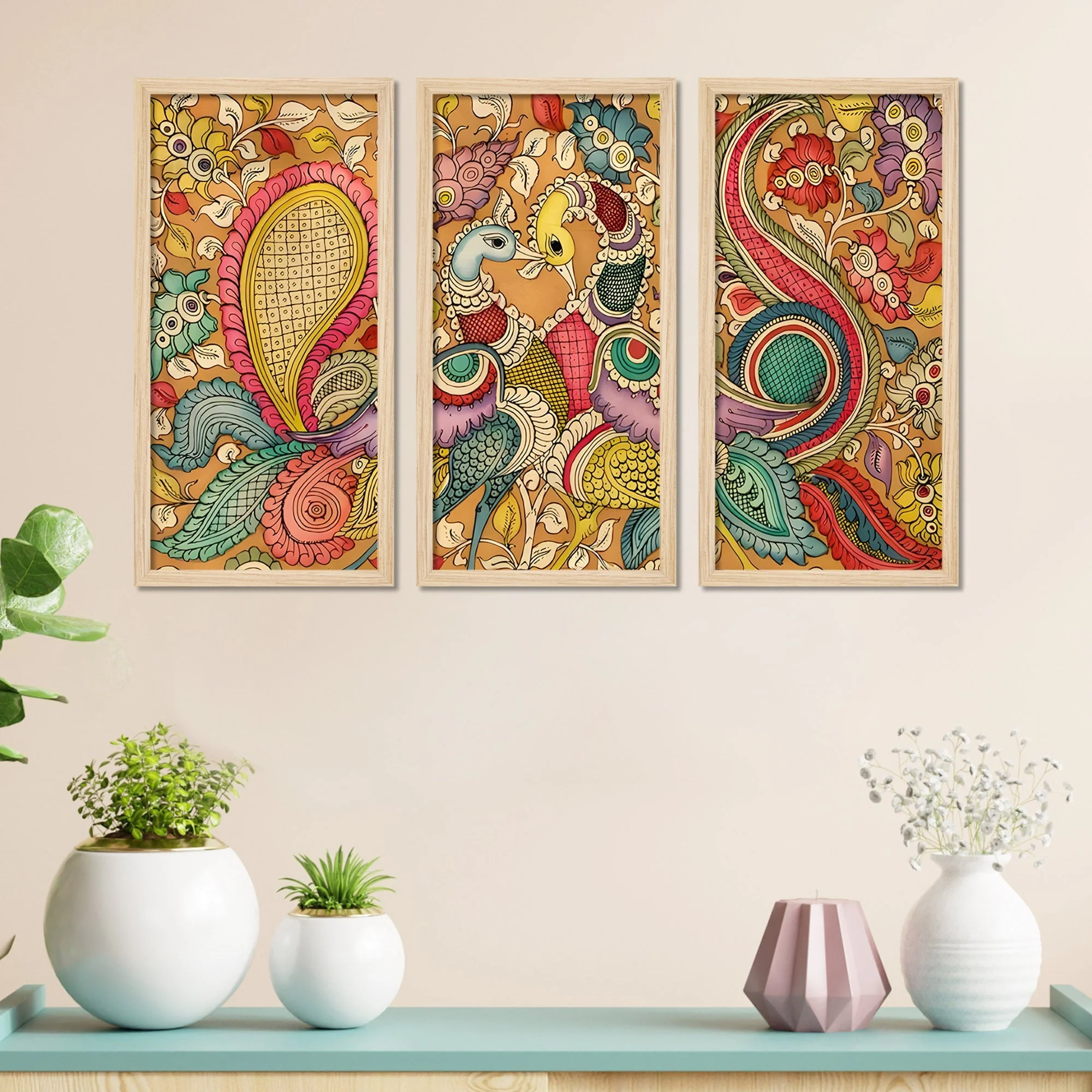 Beautiful Peacock Designer Floral Art Wooden Wall Frame Set of Three