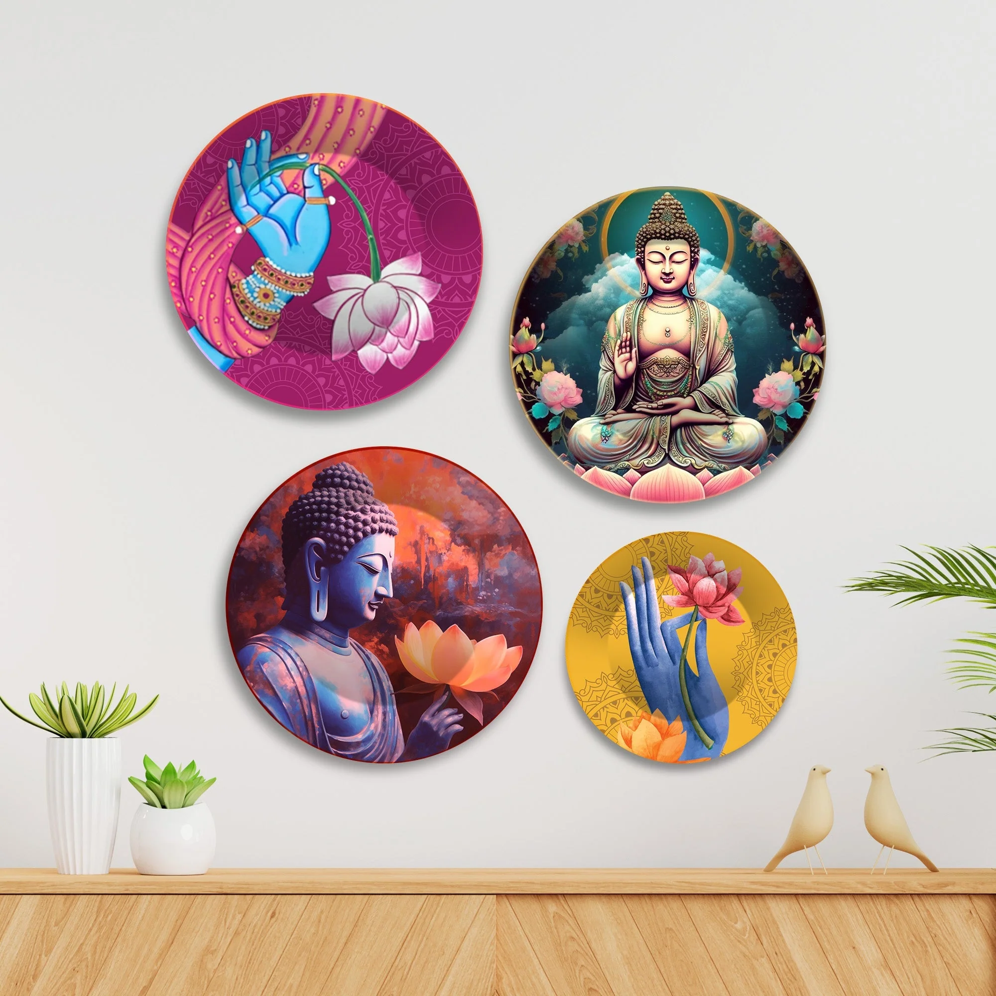 Lord Buddha Meditating Premium Wall Plates Painting Set of Four, This product is made with glossy finish and premium quality. If you're looking for a classy wall art for your home or office. Its classic design with a modern twist helps you keep an eye on the hour all the while adding panache to your decor. This designer Wall Plate will add charm to any room in your home. This wall plate can be a good gift for Living, Drawing & Dining Room, Outdoor, Gallery, Hotels, Bar, Lounge, Restaurants, Office, Reception, Kitchen Area, Balcony and Bathroom. Must be protected from sunlight, extreme temperature, dust and moisture to ensure long life. Final product colours may vary slightly from the display image due to the difference in printing resolution and digital resolution of various computer or mobile screen.